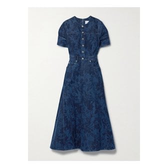 가죽 트리밍 플로럴 프린트 데님 미디 드레스 인디고 블루